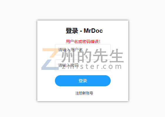 MrDoc的登录地址为:`域名/user/login/` 在MrDoc的首页右上角,鼠标悬浮停留在用户名上,亦会弹出“登录按钮”,如下所示:  访问其链接,可以进入到MrDoc的登录页面,如下图所示:  如果用户名和密码输入正确,会直接跳转到MrDoc首页。如果其中有一项输入错误,则会提示你“用户名或密码输入错误”,如下图所示:  登录成功后,会跳转到MrDoc的首页,也就是文集列表的页面。