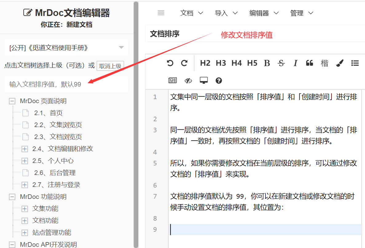 文集中同一层级的文档按照「排序值」和「创建时间」进行排序。 同一层级的文档优先按照「排序值」进行排序,当文档的「排序值」一致时,再按照文档的「创建时间」进行排序。 所以,如果你需要修改文档在当前层级的排序,可以通过修改文档的「排序值」来实现。 文档的排序值默认为 99,你可以在新建文档或修改文档的时候手动设置文档的排序值,其位置为: