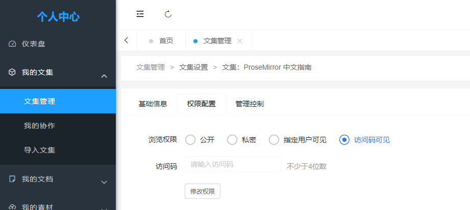 MrDoc觅思文档基于文集进行权限控制,目前支持: - 公开 - 私密 - 指定用户 - 访问码 4种文集权限模式。 你可以在「个人中心」 - 「文集管理」 - 「文集设置」对指定文集进行权限控制:  选择文集的权限: