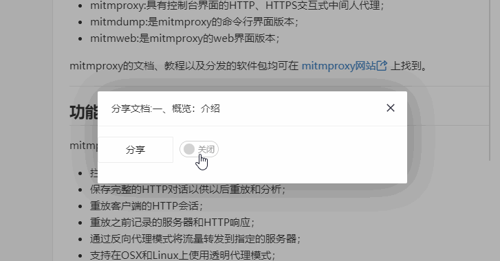 觅思文档支持文集作者、文集协作成员、文档作者对权限为非公开权限文集内的文档进行分享。目前有以下两种分享方式: - 公开分享: - 分享码分享; 如需进行分享,进入指定的文档内,点击右下角的「分享」按钮:  这会弹出分享框:  你可以控制分享的开关,然后选择分享模式: