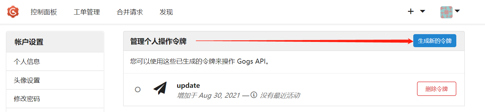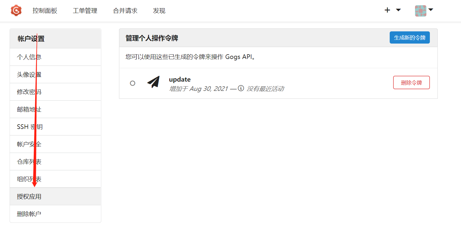 在获得 MrDoc 专业版私有仓库授权账号之后,需要首先前往「用户设置」页面:  点击「授权应用」:  点击「生成新的令牌」:  随便输入一个名称,然后点击「生成令牌」按钮: