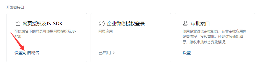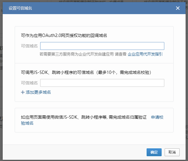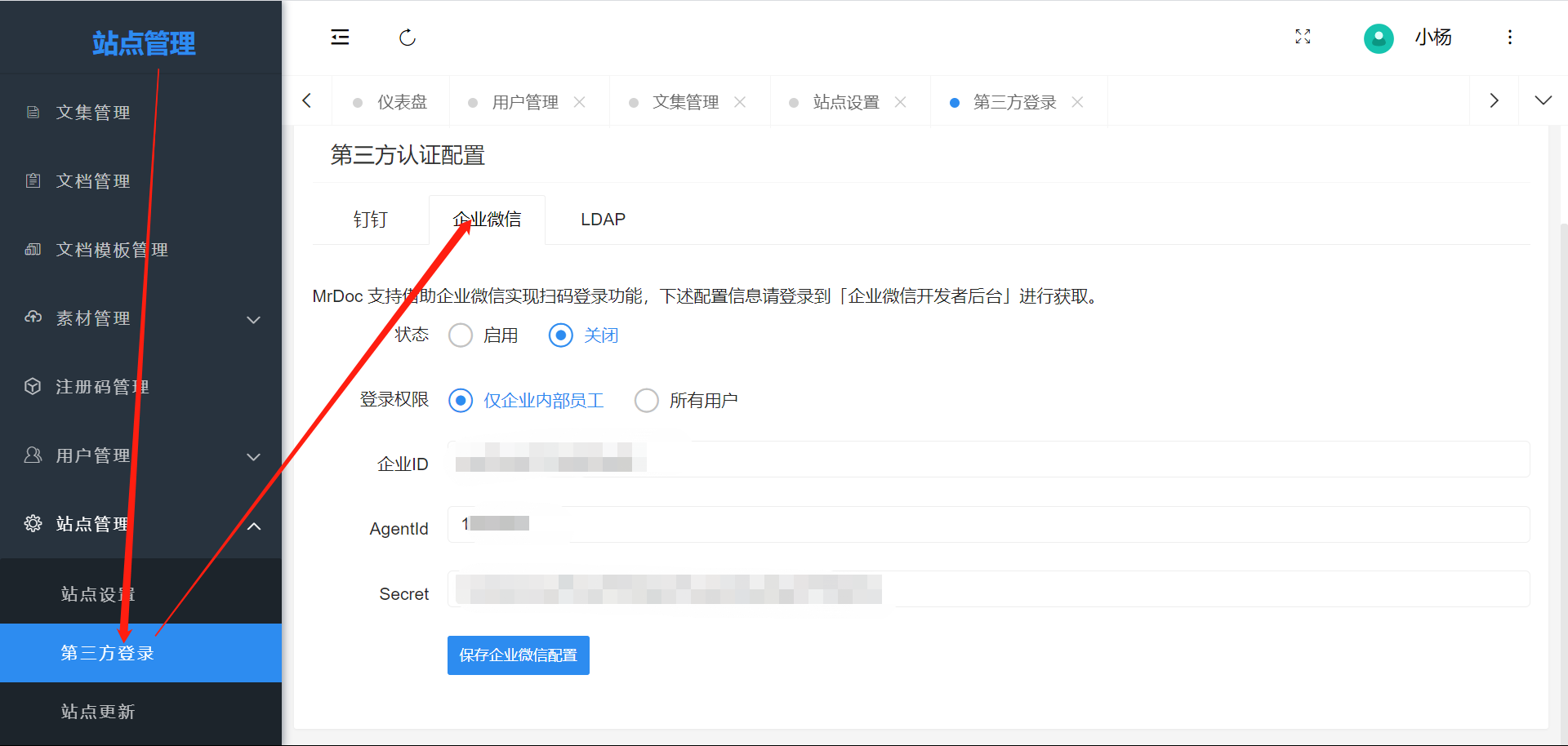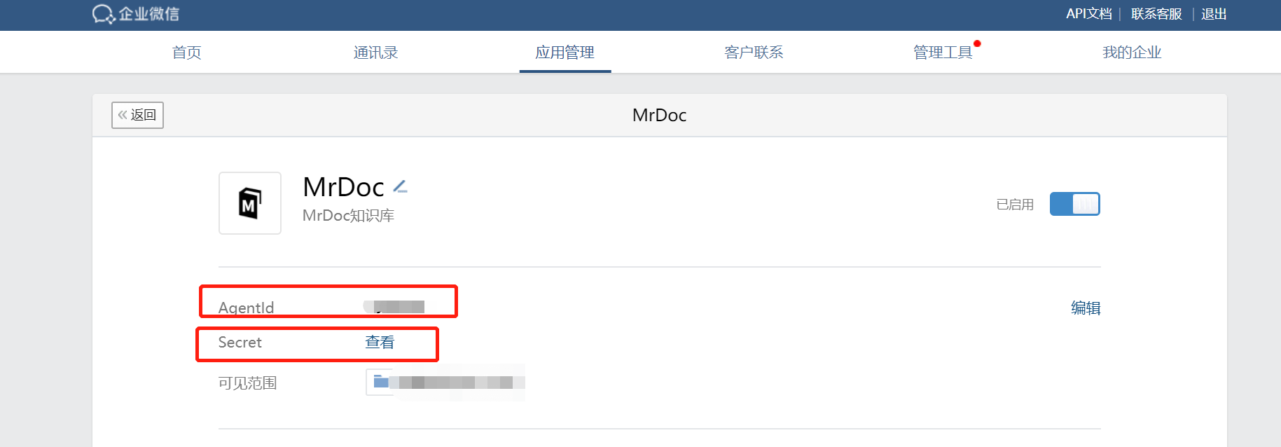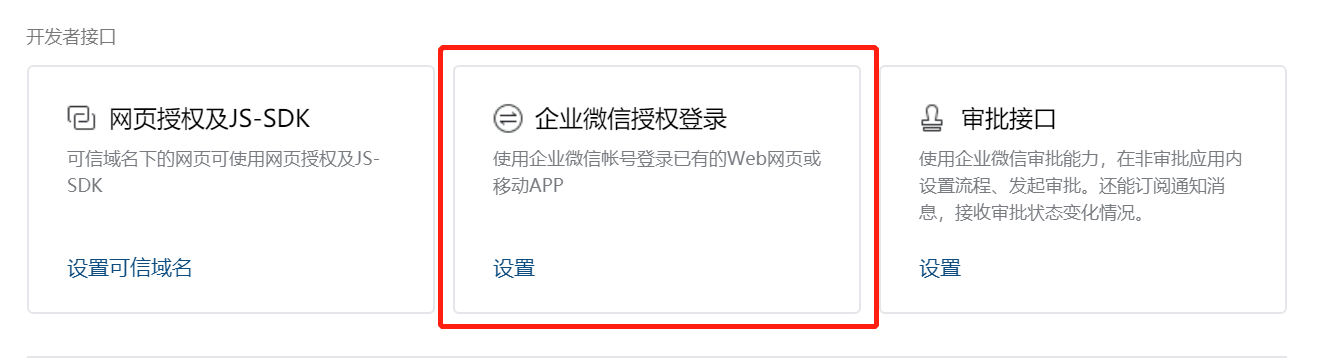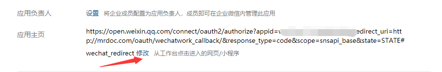 MrDoc 专业版支持企业微信「企业内部应用」的**扫码登录**接入和**免登配置**。 ## 一、创建企业微信应用 登录进入企业微信管理后台,在「应用管理」页面  滚动到页面底部,在「自建」分类下点击「创建应用」:  按照要求填写信息即可:  应用创建后会进入到应用的管理页面:  其中的「AgentId」和「Secret」信息需要复制下来,以备后面配置之用。 ## 二、配置企业微信应用 ### 可信域名验证 下载域名验证文件后,可以使用 Nginx 进行域名验证配置,或在觅思文档中进行配置,参考文档:[https://doc.mrdoc.pro/doc/3990/#h2-配置文本文件访问](https://doc.mrdoc.pro/doc/3990/#h2-配置文本文件访问) ### 应用主页配置 点击设置「应用主页」:  按照如下URL填入网页地址: ``` https://open.weixin.qq.com/connect/oauth2/authorize?appid={企业ID}&redirect_uri={域名}/oauth/wechatwork_callback/&response_type=code&scope=snsapi_base&state=STATE#wechat_redirect ```  例如,企业ID为`123456`,域名为`http://mrdoc.com`,那么应用主页地址为如下所示: ``` https://open.weixin.qq.com/connect/oauth2/authorize?appid=123456&redirect_uri=http://mrdoc.com/oauth/wechatwork_callback/&response_type=code&scope=snsapi_base&state=STATE#wechat_redirect ``` ### 企业可信IP配置 配置企业可信IP为你的服务器IP地址  ### 网页授权及JS-SDK配置 在「网页授权及JS-SDK」中点击「设置可信域名」  填入你的 MrDoc 域名地址:  ### 企业微信授权登录配置 页面滚动到底部,在「开发者接口」中对「企业微信授权登录」进行设置:  在设置页面的「Web网页」下点击编辑,输入你的 MrDoc 专业版应用部署的域名或IP地址。  点击保存即可。 ## 三、配置MrDoc 以管理员身份登录到 MrDoc 专业版,进入「站点管理」的「第三方登录」页面:  在「企业微信」选项卡中,选择「启用」、将企业微信应用的「AgentId」和「Secret」分别填入到对应表单之中。 至于「企业ID」,需要到企业微信管理后台的「我的企业」页面进行获取:  在企业信息页面滚动到底部,可以看到「企业ID」  将其复制填入到 MrDoc 专业版配置的表单中即可。 最后点击保存,即完成了 MrDoc 专业版企业微信扫码登录的配置。 ## 四、扫码登录 开启企业微信扫码登录之后,在 MrDoc 专业版的登录页面,会显示企业微信的图标。  点击企业微信图标,会跳转到企业微信的扫码界面。手机扫码确认登录之后,会通过验证。 ## 五、免登 完成上述配置,通过企业微信工作台应用列表中点击创建的应用,就可以免登访问 MrDoc。 ## 六、其他配置 ### 同步企业微信成员至觅思文档 你可以在「企业微信」认证接入的配置页面内将企业微信的成员批量同步至觅思文档。 目前支持如下三种同步方式: - 导入企业微信用户为觅思文档用户; - 导入企业微信用户为觅思文档用户,企业微信用户所属的部门导入为觅思文档用户组,用户添加进用户组; - 清理觅思文档内的企业微信用户,企业微信中不存在的用户将被置为「禁用」状态; ### 企业微信账号与觅思文档账号绑定 如果直接通过企业微信进行登录,将会在觅思文档账号体系内创建一个新的账号。除此之外,你还可以将企业微信绑定到已存在的觅思文档账号中。 操作方法为:进入个人中心页面,点击「个人管理」菜单的「个人设置」,切换到「第三方账号」,点击「绑定企业微信账号」,进行配置即可。