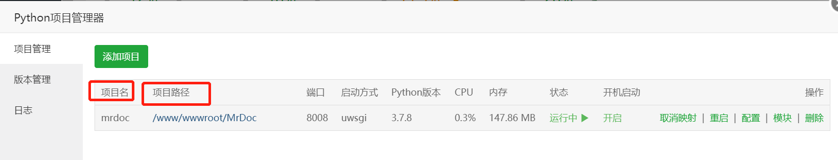 > d 下述文档仅支持宝塔面板「Python项目管理器1.9版本」 使用宝塔面板的「Python项目管理器」可以很方便地部署 Python Web 应用。 MrDoc 也推荐使用宝塔面板进行部署。  在某些情况下,我们需要在宝塔面板的命令行终端手动执行一些 MrDoc 的命令,这些时候需要在 MrDoc 的项目目录内激活虚拟环境后再进行命令的执行。 宝塔面板的「Python项目管理器」窗口中有介绍如何使用项目的虚拟环境  在此我们做一个示例介绍。 ## 激活虚拟环境 示例项目名为:`mrdoc` 示例项目路径为:`/www/wwwroot/MrDoc`  所以项目的虚拟环境路径为:`/www/wwwroot/MrDoc/{项目名}_venv`,也就是`/www/wwwroot/MrDoc/mrdoc_venv` 激活虚拟环境的命令为: ``` source /www/wwwroot/MrDoc/mrdoc_venv/bin/activate ``` 我们可以点击项目路径,跳转到项目路径所在的目录,输入下述命令快速激活虚拟环境: ``` source ./mrdoc_venv/bin/activate ``` 如下图所示:  ## 退出虚拟环境 如果在激活虚拟环境之后需要退出虚拟环境,直接在命令行终端输入如下命令即可: ``` deactivate ```