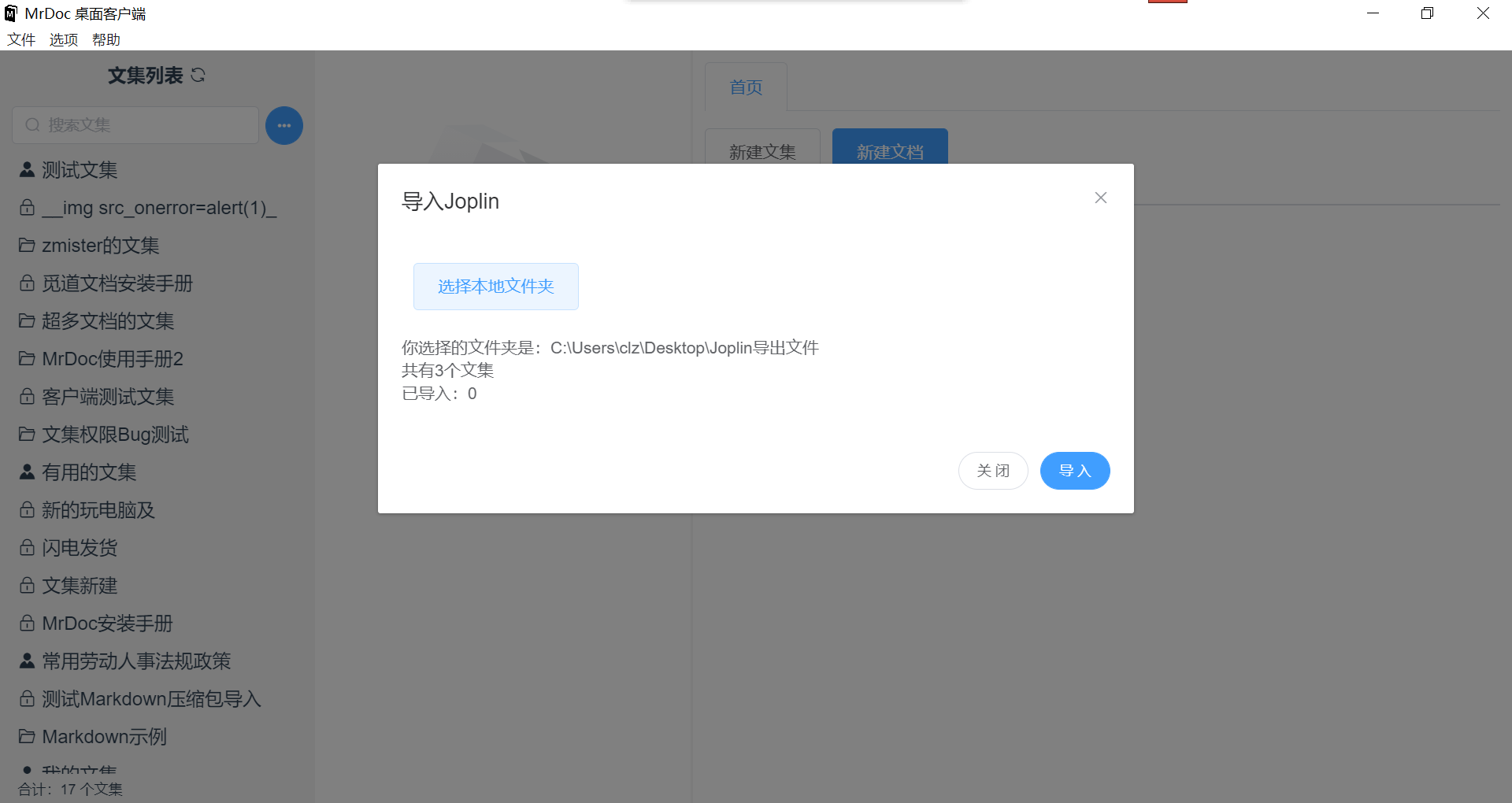 MrDoc 觅思文档支持将 Joplin 中的文档导入到 MrDoc 觅思文档中。 ## 一、新建一个文件夹 首先,在桌面新建一个文件夹,用于存放 Joplin 导出的文件。  ## 二、导出 Joplin 笔记本 打开最新版本的 Joplin,点击「文件」菜单,选择「全部导出」-->「MD - Markdown」:  在弹出的文件夹选择框中选择之前新建的空文件夹:  之后可以看到 Joplin 中的笔记本已经导出到了文件夹中:  ## 三、导入 MrDoc 觅思文档 打开 MrDoc 桌面客户端,在首页点击「导入 Joplin」按钮。  在弹出框界面中点击「选择本地文件夹」按钮,选择之前新建的文件夹:  最后点击「导入」按钮即可。
