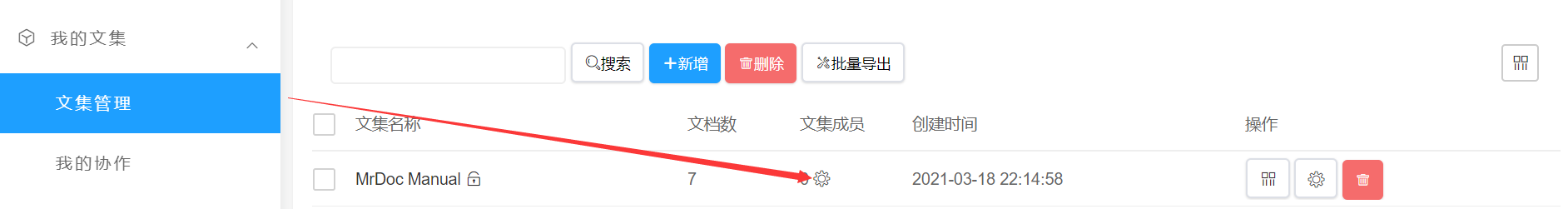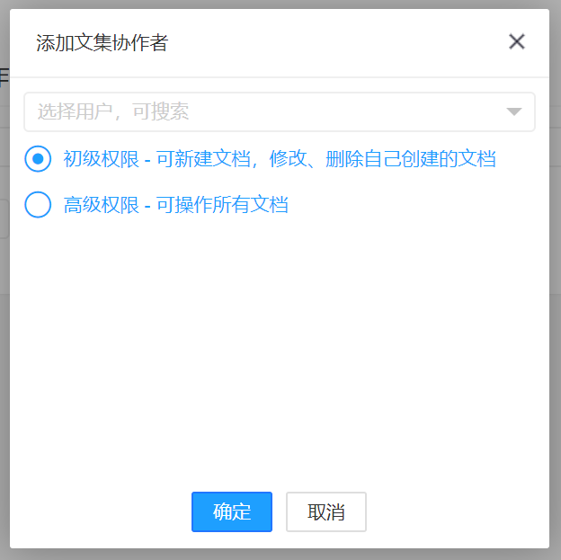默认情况下,文集内只有文集作者可以创建文档。 如果你需要让其他用户/用户组参与到文集的文档创作中,那么可以添加文集的【协作成员】。 操作路径为:【个人中心】-->【文集管理】页面中的文集列表表格中点击「成员」:  或「文集成员」列数据旁的「设置」图标:  以进入文集成员管理页面,并按需添加成员的协作成员:  添加完成之后,文集的协作成员在文集内即可进行创作:  ## 协作成员权限 **初级权限**:可以在文集内新建文档,可以修改和删除自己创建的文档; **高级权限**:可以在文集内新建、删除和修改任何文档;