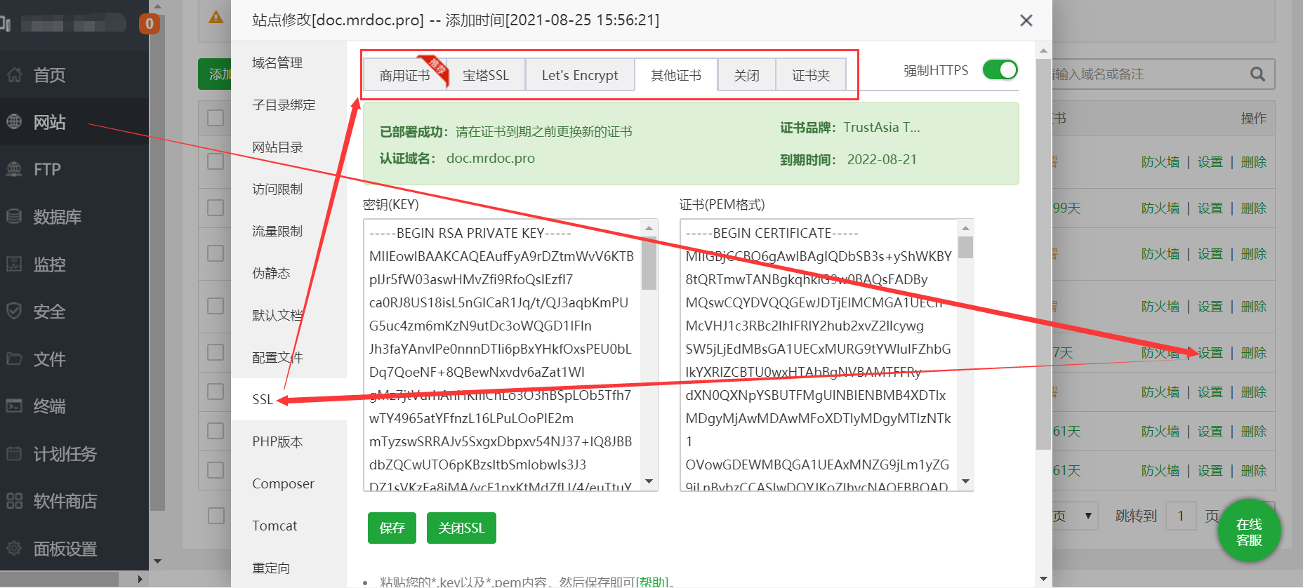 ## Nginx 配置 见 Nginx 官方文档:[Configuring HTTPS servers](https://nginx.org/en/docs/http/configuring_https_servers.html "Configuring HTTPS servers") ## 宝塔面板设置方法