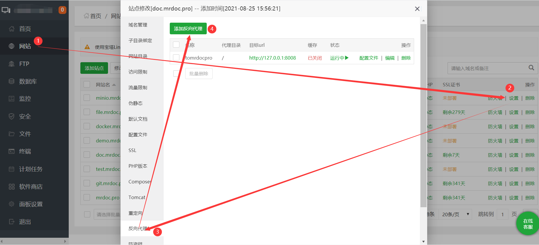 使用 uWSGI/Gunicorn/Docker 运行 MrDoc 后,MrDoc 可以`IP:端口号`的形式直接进行访问。 但是我们更推荐使用 Nginx 进行反向代理。 那么可以在`nginx.conf`文件中,将下面的`server`部分增加至 http 分区内并重载配置: ```bash server { listen 你的端口; server_name 你的域名或IP; location / { proxy_pass http://127.0.0.1:10086; proxy_set_header Host $host; proxy_set_header X-Real-IP $remote_addr; proxy_set_header X-Forwarded-For $proxy_add_x_forwarded_for; proxy_set_header REMOTE-HOST $remote_addr; proxy_set_header X-Forwarded-Proto $scheme; #Set Nginx Cache add_header Cache-Control no-cache; add_header X-Cache $upstream_cache_status; proxy_ignore_headers Set-Cookie Cache-Control expires; proxy_read_timeout 300; # 流式视频处理 proxy_set_header Range $http_range; proxy_set_header If-Range $http_if_range; add_header X-Accel-Buffering no; } } ``` ## 宝塔面板操作 ### 1、添加网站  ### 2、添加反向代理  ### 3、设置反向代理 添加完反向代理之后,我们推荐你在配置文件的`location / {}`中继续添加如下配置: ``` proxy_set_header Host $host; proxy_set_header X-Real-IP $remote_addr; proxy_set_header X-Forwarded-For $proxy_add_x_forwarded_for; proxy_set_header REMOTE-HOST $remote_addr; proxy_set_header X-Forwarded-Proto $scheme; add_header X-Cache $upstream_cache_status; proxy_set_header Range $http_range; proxy_set_header If-Range $http_if_range; # 流式视频处理 proxy_set_header Range $http_range; proxy_set_header If-Range $http_if_range; add_header X-Accel-Buffering no; ``` 相关配置的作用: - `proxy_set_header Host $host;`:确保 MrDoc 接收请求时,能看到客户端请求的域名。 - `proxy_set_header X-Real-IP $remote_addr;`:把客户端的真实 IP 传递给 MrDoc。 - `proxy_set_header X-Forwarded-For $proxy_add_x_forwarded_for;`:记录客户端通过代理的 IP 列表。 - `proxy_set_header X-Forwarded-Proto $scheme;`:把客户端使用的协议(HTTP 或 HTTPS)传递给 MrDoc。