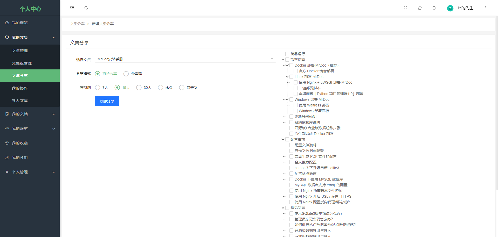 >d 站点管理员可在后台站点设置中关闭此功能 如果你需要将文集内某些文档一起分享出去,那么可以使用「文集分享」功能。 在「个人中心」页面的「文集管理」菜单栏下,进入「文集分享」页面。 点击「新增」按钮,选择需要分享的文集、需要分享的文档、指定分享的模式(直接分享、分享码)、指定分享有效期(永久、指定日期) 最后点击「立即分享」按钮即可。