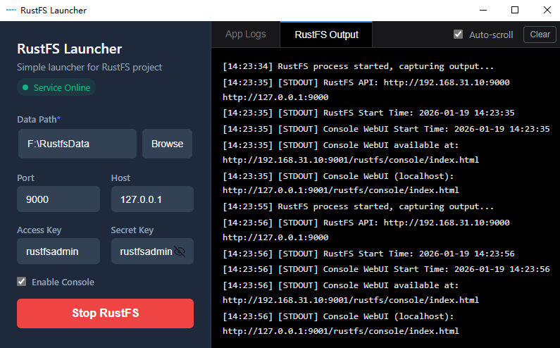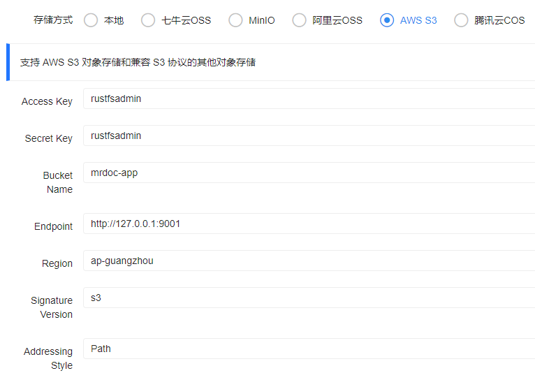 AWS S3 或其他兼容 S3 协议的对象存储(七牛云、腾讯云、阿里云、RustFS等)都可使用此方式设置。 ## RustFS 示例 >i 1. RustFS 的地址风格需要选择为`Path` > 2. 据 RustFS 官方文档介绍:[Python SDK | RustFS 文档中心](https://docs.rustfs.com.cn/developer/sdk/python.html#%E4%B8%89%E3%80%81%E8%BF%9E%E6%8E%A5-rustfs),RustFS 不校验 region,填写任意值均可 RustFS 信息:  在觅思文档中的配置信息如下:
