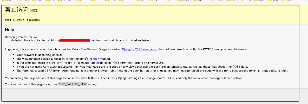 ## 类似问题截图 开启Debug调试后的网页显示类似下面这样:  接口错误响应像下面这样: ``` "detail": "CSRF Failed: CSRF token from the X-CSRFToken HTTP header incorrect." ``` ## 原因 协议头没有传递给后端应用,导致 CSRF 验证失败,两个解决方法: - 1、在Nginx反向代理中配置proxy_set_header X-Forwarded-Proto $scheme;,详见:https://doc.mrdoc.pro/doc/44910/ - 2、手动在配置文件中指定CSRF验证的可信地址,也就是主机的URL(例如:https://doc.mrdoc.pro ),详见:https://doc.mrdoc.pro/doc/3445/#h2-CSRF可信来源配置