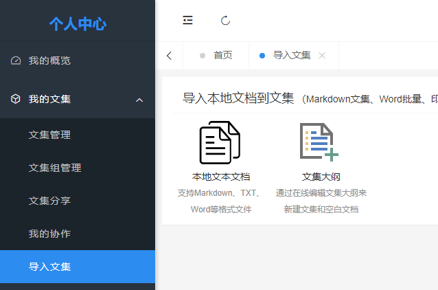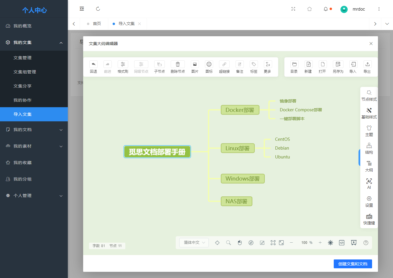 MrDoc觅思文档在 Web 网页端的导入主要在两个地方: - 文档编辑器,主要是将单一文档导入到文档编辑器; - 个人中心,批量导入 ## 1. 文档编辑器导入 进入「新建文档」页面,鼠标悬浮在顶部导航栏的「导入」菜单上,会显示支持导入的文档类型,选择需要导入的文档类型后,在本地文件选择框里面选择需要导入的文件,等待后台上传转换即可。 目前支持: - 文本文档(Markdown、Text 等)、 - .docx格式的Word文档 - 各类 Office 文档  ## 2. 个人中心导入 个人中心支持两种导入方式: - 本地文档导入 - 文集大纲导入 入口为:「个人中心」-「文集管理」-「导入文集」  ### 2.1 本地文档导入 此导入方式支持批量将本地Markdown、text和docx格式的Word文件导入到指定文集。  导入文档后点击「发布文档」按钮即可。 ### 2.2 文集大纲导入 文集大纲导入可以便捷地通过可视化思维导图编辑器创建一个预设了文档结构的文集,思维导图的结构即是文集内文档的结构,一级节点是文集名称、其余子节点都是层级的文档。  编辑好文集结构后,点击「创建文集和文档」按钮即可。
