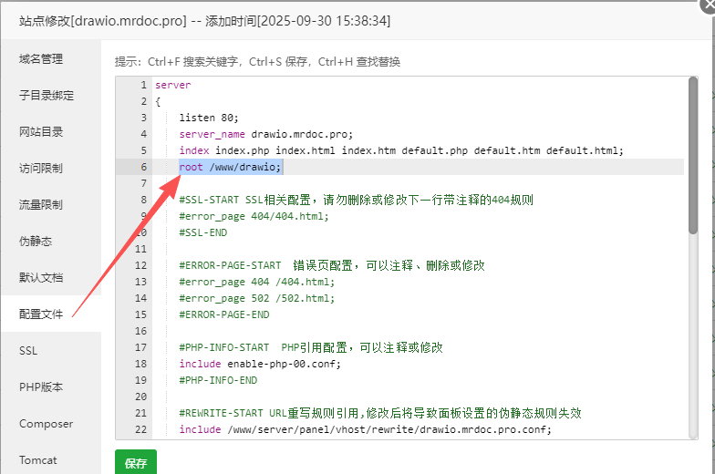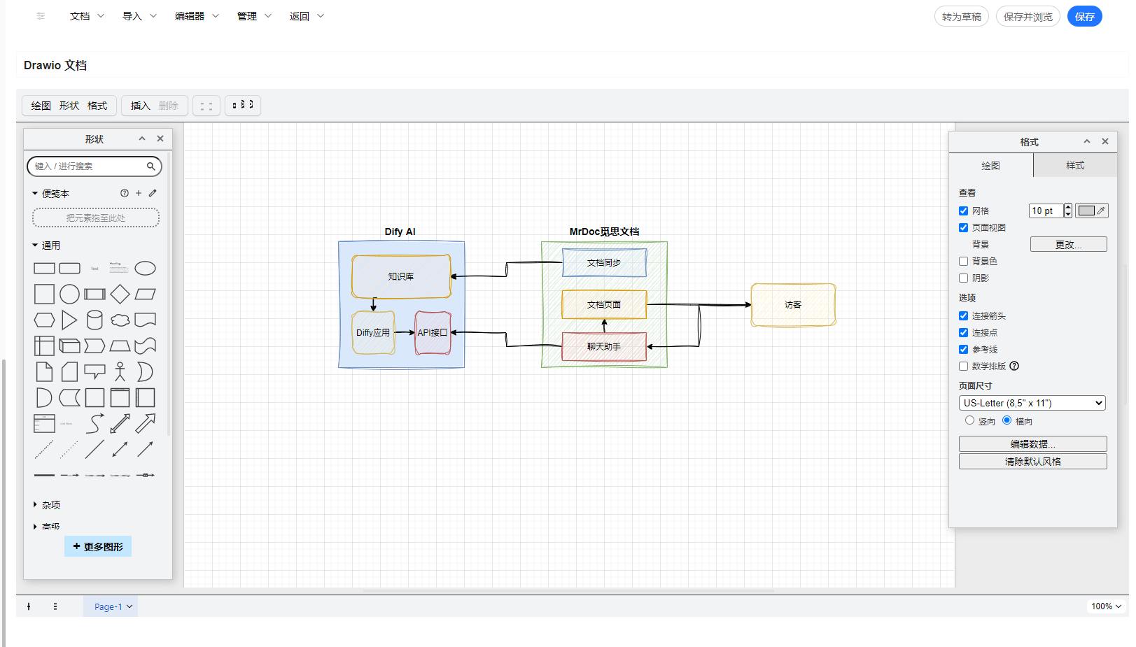 Drawio 是一个免费开源的在线图表绘制工具,觅思文档支持接入 Drawio 图形编辑器来创建 Drawio 文档。 ## 一、部署 Drawio 在接入 Drawio 之前,你需要自行部署好 Drawio 服务。下面介绍两种部署方式: ### 1.1、宝塔直接部署 在 Drawio 的 GitHub 仓库(https://github.com/jgraph/drawio/releases )下载最新的`war`格式安装包文件:  然后上传到服务器并解压到`/www/`目录下:  接着添加一个站点,在站点设置的配置文件中,将`root` 的路径修改为`/www/drawio`:  这样访问域名就可以看到熟悉的 Drawio 界面了。 ### 1.2、Docker 部署 如果你更偏向于容器化部署,那么执行下面的命令即可在8080端口上运行起一个Drawio服务: ``` docker run -d --restart=always --name="draw" -p 8080:8080 jgraph/drawio ``` ## 二、接入 Drawio 在 Drawio 部署好之后,在后台管理页面-站点管理-站点设置-文档设置中的,将Drawio地址填入 Drawio 配置表单即可:  然后在首页或文档内的新建文档下拉按钮中,就可以选择新建「Drawio」文档:  然后在 Drawio 编辑器中创建各类图形: