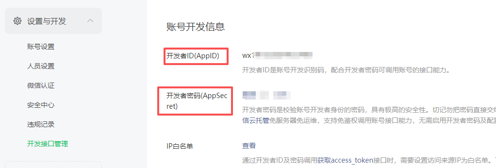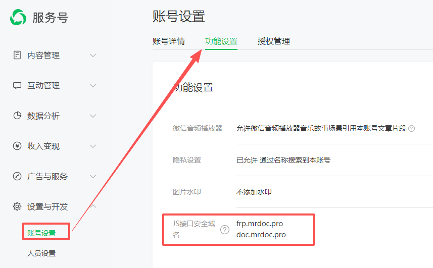 微信网页授权借助已认证的微信服务号,实现在微信客户端内打开觅思文档的链接时,通过调用微信的授权接口,实现自动认证和登录。 ## 获取微信公众号信息 在微信公众号管理平台的「开发接口管理」页面,获取服务号的`APPID`和`AppSecret`信息:  在「账号设置」页面将你的觅思文档域名添加到「JS接口安全域名」:  ## 觅思文档配置 在后台站点管理-站点设置页面的「微信网页」配置选项卡中: - 填入对应的微信公众号APPID和APPSECRET信息 - 启用「微信网页授权」开关 就完成了微信网页授权的配置: