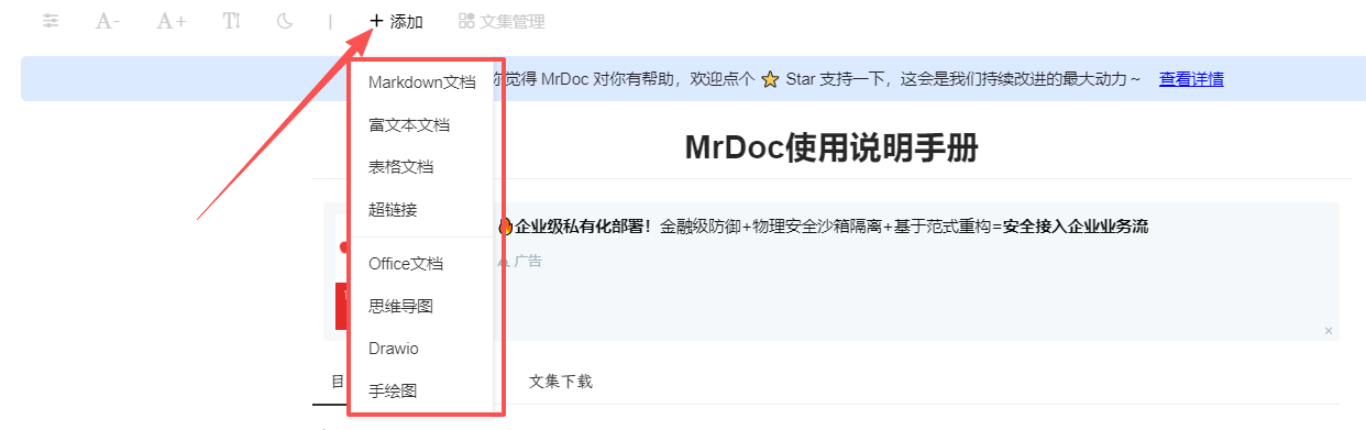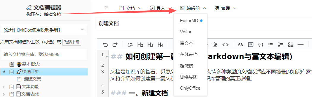 ## 如何创建第一篇文档(Markdown与富文本编辑) 文档是知识库的基石,觅思文档(MrDoc)支持多种类型的文档以适应不同场景的知识库需求。本文将介绍如何创建第一篇文档,助你开启知识库管理的真正旅程。 ### 一、新建文档 通常来说,你会在首页顶部「新建」菜单里面选择一个文档类型以开始文档的编辑。  除此之外,你还可以在文集文档页面的顶部工具栏里面选择文档类型以新建文档。  或者,在文集文档页面的左侧文集目录中新建指定文档的下级文档。  ### 二、切换文档编辑器 在你进入进入新建文档页面之后,如果发现当前的编辑器不是自己想要的,那么可以在顶部工具栏的编辑器里面切换别的编辑器使用。