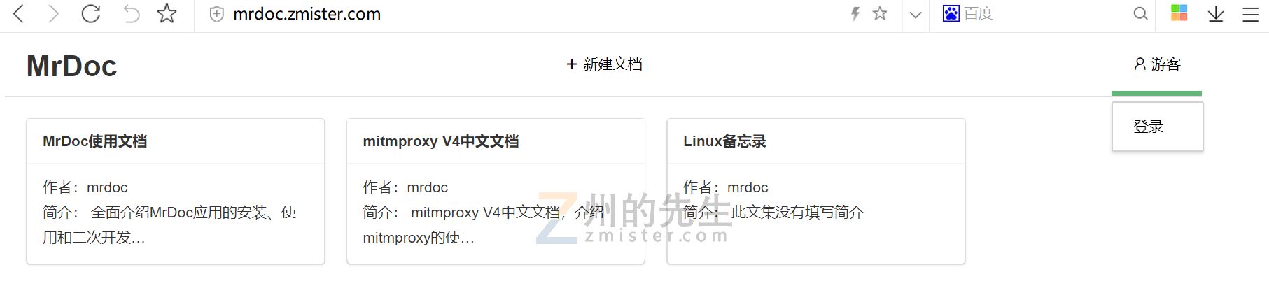 MrDoc的登录地址为:`域名/user/login/` 在MrDoc的首页右上角,鼠标悬浮停留在用户名上,亦会弹出“登录按钮”,如下所示:  访问其链接,可以进入到MrDoc的登录页面,如下图所示:  如果用户名和密码输入正确,会直接跳转到MrDoc首页。如果其中有一项输入错误,则会提示你“用户名或密码输入错误”,如下图所示:  登录成功后,会跳转到MrDoc的首页,也就是文集列表的页面。