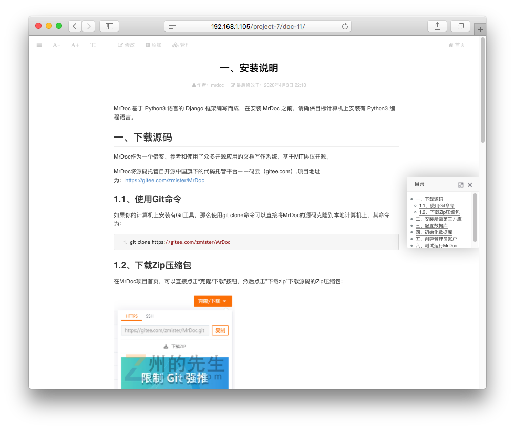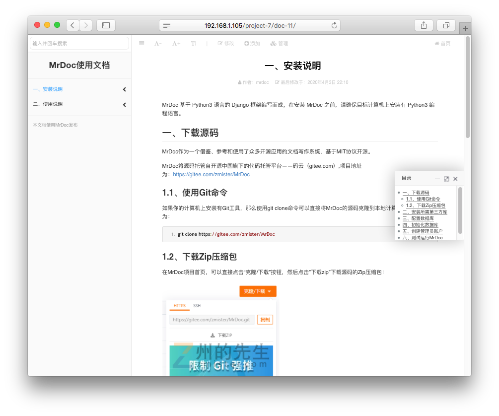 从`MrDoc`文集浏览阅读页面的大纲点击某一个文档的链接,会跳转到文档的浏览阅读页面,如下图所示:  `MrDoc`的文集文档浏览阅读页面均是两栏式的布局,其中: - 左侧为文集文档内容的边栏; - 右侧为文集文档内容的主体; ## 左侧大纲 文集浏览阅读页面的左侧由三个部分组成: 1. 文集内容搜索框 2. 文集名称 3. 文集的文档大纲 ### 文档大纲 左侧布局会显示文集下所有文档的层级关系,从而形成文集的文档大纲(或者称之为文档树)。`MrDoc`目前最多支持3级的文档,也就是能够作为上级文档的只能是第2级的文档了。 在文档浏览阅读页面,文档树默认只显示第1层级的文档以及当前文档所处的层级,同时文档大纲中的当前文档链接会显示成蓝色,以标识当前浏览阅读的文档在文集大纲中所处的位置。 你可以点击文档右侧的图标:fa-chevron-left: 来展开此层级的文档树,然后可以点击文档右侧的图标:fa-chevron-down: 来收起此层级的文档树。 ### 搜索框 此处的搜索框不同于首页的搜索框,只能搜索本文集内文档的内容。搜索结果将在右侧布局中展现出来,如下图所示:  ## 右侧内容主体 页面的右侧是文档的内容主体部分,其由以下3个部分组成: 1. 顶部控制栏 2. 中部内容栏 3. 底部分享栏 同时,还有两个悬浮的块: - 文档目录悬浮框 - 返回顶部悬浮图标 下面我们一一进行介绍。 ### 顶部控制栏 顶部的控制栏用于控制页面的布局以及进行额外的管理。无论访问此页面的用户是否登录,都会有以下几个图标按钮: - :fa-align-justify: 用于收起和展开左侧大纲; - :fa-text-height: 用于切换页面字体的类型(衬线体和非衬线体) - :fa-font:-+ 用于跳转页面字体的大小  ### 中部内容栏 中部的内容栏将会自上而下显示文集的名称、文集的简介、文集下的文档大纲链接(可点击跳转到对应的文档)、文集的导出文件下载(需要文集的创建者在个人中心开放此文集的导出文件下载) ### 底部分享栏 最后的底部是社交分享栏,集成了常见的社交平台的分享按钮,方便用户将文集快速分享出去。 ### 文档目录悬浮框 用于快速定位和跳转文档内各个标题、子标题,同时这个悬浮框还可以最小化、最大化和关闭。 ### 返回顶部图标 当文档内容过多时,页面内容会很长,这个时候如果需要回到文档顶部,最好的方法就是点击“**返回顶部**”图标了。