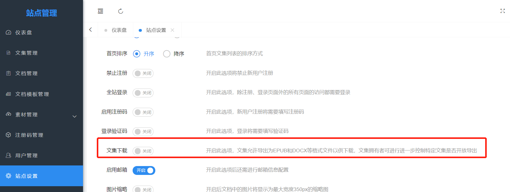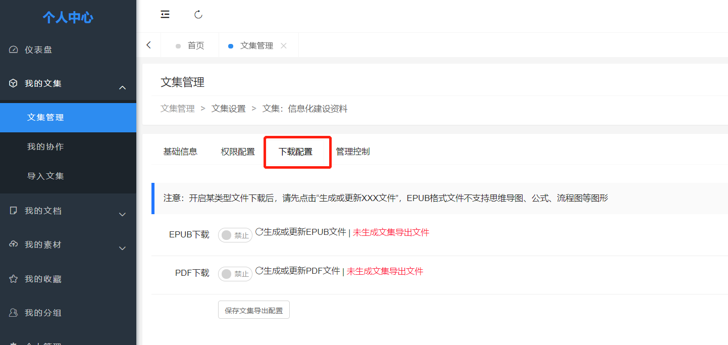 觅思文档支持将文集内的文档生成导出为 PDF 格式文件、EPUB格式文件和Word格式文件。 如需为文集生成上述文件,首先需要站点管理员在「后台管理」 - 「站点设置」中开启「文集下载」开关:  在这个开关开启之后,「个人中心」 - 「文集管理」 - 「文集设置」中会新增一个「下载配置」选项卡,你可以在这里生成文集各类格式文件并下载到本地:  如果提示异常,请检查服务器是否安装正确 Chromium 和 chromedriver。详见:https://doc.mrdoc.pro/doc/1365/