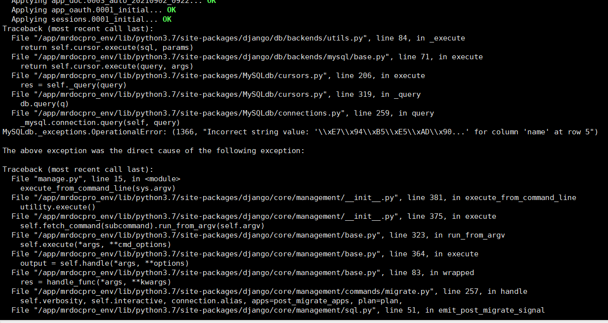 如果你在 MrDoc 中配置了 MySQL 数据库,在执行数据库迁移命令: ``` python manage.py migrate ``` 时,可能会出现如下所示的报错:  这表示 MySQL 数据库中字符编码存在问题。 可以在命令行进入 MySQL终端,输入如下命令查询数据库字符编码: ``` show variables like '%char%'; ``` 返回结果: ``` mysql> show variables like '%char%'; +--------------------------+----------------------------+ | Variable_name | Value | +--------------------------+----------------------------+ | character_set_client | utf8 | | character_set_connection | utf8 | | character_set_database | latin1 | | character_set_filesystem | binary | | character_set_results | utf8 | | character_set_server | latin1 | | character_set_system | utf8 | | character_sets_dir | /usr/share/mysql/charsets/ | +--------------------------+----------------------------+ 8 rows in set (0.00 sec) ```
