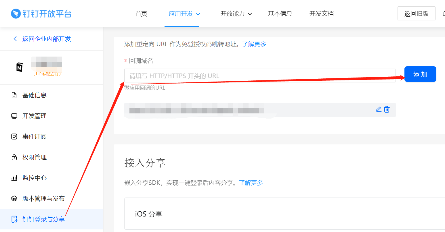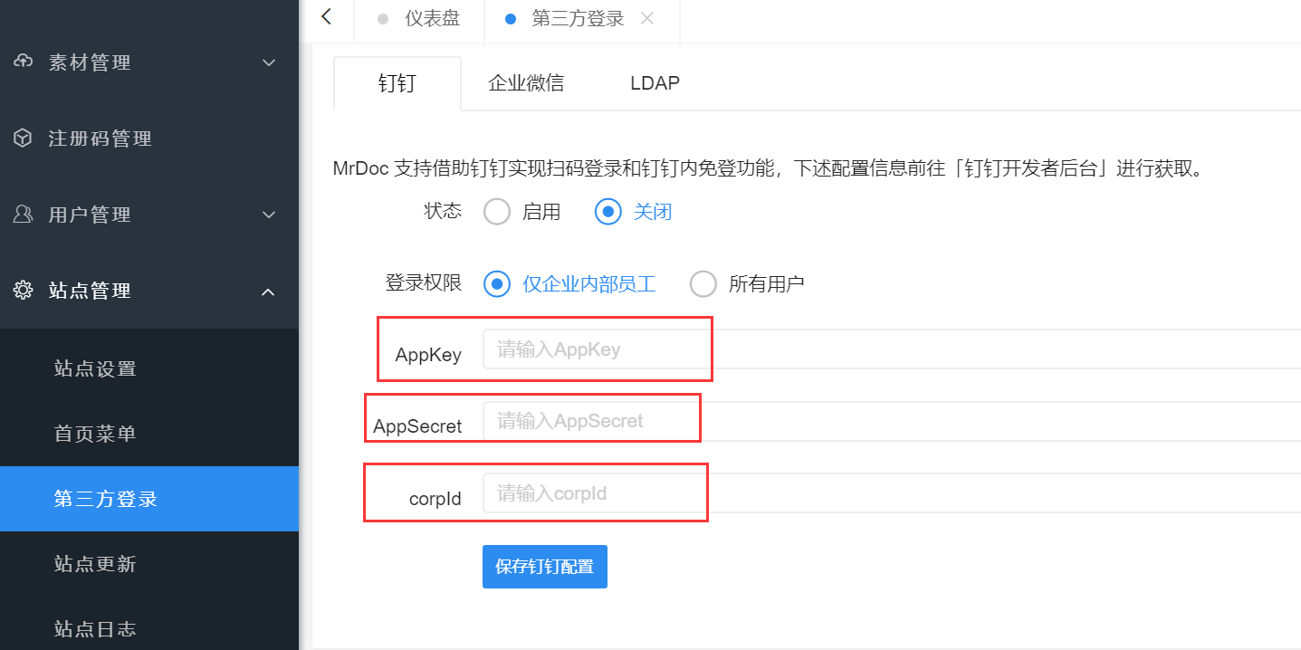 MrDoc 专业版支持钉钉「企业内部应用」的扫码登录接入。 ## 零、获取CorpId 在「钉钉开放平台」的开发者后台中,可以看到自己企业的CorpId,如下图所示:  ## 一、创建钉钉应用 在钉钉开发平台中点击「应用开发」,选择「企业内部开发」:  进入到企业内部开发的页面,按照下图所示,点击「创建应用」:  选择「H5微应用」,按要求填写好应用信息:  创建好之后会进入到应用的基本信息页面,如下图所示:  页面中的「应用凭证」中的「AppKey」和「AppSecret」需要复制下来,后面我们将使用到。 ## 二、配置钉钉应用 正如钉钉开发平台所说:在开发前,需要在开发者后台配置服务器出口IP、应用首页等。 新创建的钉钉应用,还需要在「开发管理」页面中对服务器出口IP、应用首页等信息进行配置。  >d 服务器出口IP必须配置成 MrDoc 专业版部署的服务器的IP。 >d 应用首页即是你部署的 MrDoc 的首页URL。 ## 三、配置回调URL 在「钉钉登录与分享」页面,输入`你的域名或IP/oauth/dingtalk_callback/`,例如: ``` https://doc.mrdoc.pro/oauth/dingtalk_callback/ ```  ## 四、开通钉钉应用权限 因为 MrDoc 专业版对接钉钉的扫码登录需要读取到钉钉用户的一些信息以完成用户的认证、鉴权和登录,所以还需要为创建的钉钉应用赋予一些权限。 点击左侧「权限管理」菜单,进入到「权限管理」页面:  开通以下三个权限: - 成员信息读取权限; - 调用OpenApp专有API时需要具备的权限; - 调用企业API基础权限(默认开通);  ## 五、配置MrDoc 以管理员身份登录到 MrDoc 专业版,进入「站点管理」的「第三方登录」页面:  在「钉钉」选项卡中,选择「启用」、将钉钉应用的「AppKey」、「AppSecret」和「corpId」分别填入到对应表单之中。 最后点击保存,即完成了 MrDoc 专业版钉钉扫码登录的配置。 ## 六、登录 ### 6.1、扫码登录 开启钉钉扫码登录之后,在 MrDoc 专业版的登录页面,会显示钉钉的图标。  点击钉钉图标,会跳转到钉钉的扫码界面。手机扫码确认登录之后,会通过验证。 ### 6.2、钉钉内免登 如果你通过钉钉PC端或移动端的工作台访问创建刚刚创建的应用,那么会实现免登认证MrDoc: