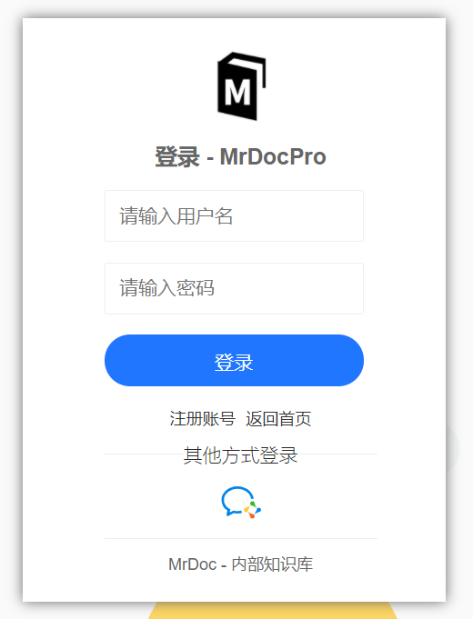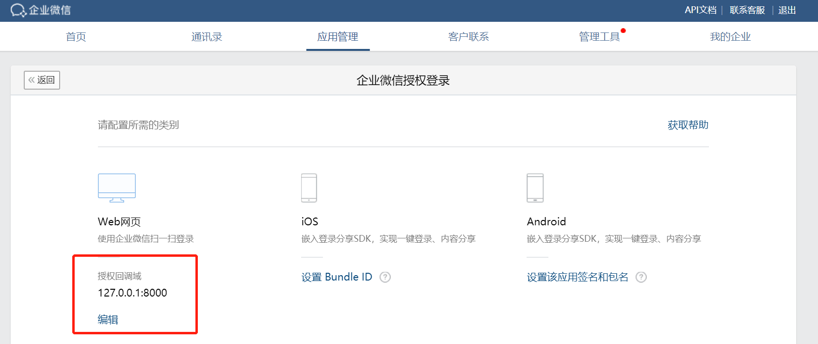 MrDoc 专业版支持企业微信「企业内部应用」的**扫码登录**接入和**免登配置**。 ## 一、创建企业微信应用 登录进入企业微信管理后台,在「应用管理」页面  滚动到页面底部,在「自建」分类下点击「创建应用」:  按照要求填写信息即可:  应用创建后会进入到应用的管理页面:  其中的「AgentId」和「Secret」信息需要复制下来,以备后面配置之用。 ## 二、配置企业微信应用 ### 可信域名验证 下载域名验证文件后,可以使用 Nginx 进行域名验证配置,或在觅思文档中进行配置,参考文档:[https://doc.mrdoc.pro/doc/3990/#h2-配置文本文件访问](https://doc.mrdoc.pro/doc/3990/#h2-配置文本文件访问) ### 应用主页配置 点击设置「应用主页」:  按照如下URL填入网页地址: ``` https://open.weixin.qq.com/connect/oauth2/authorize?appid={企业ID}&redirect_uri={域名}/oauth/wechatwork_callback/&response_type=code&scope=snsapi_base&state=STATE#wechat_redirect ```  例如,企业ID为`123456`,域名为`http://mrdoc.com`,那么应用主页地址为如下所示: ``` https://open.weixin.qq.com/connect/oauth2/authorize?appid=123456&redirect_uri=http://mrdoc.com/oauth/wechatwork_callback/&response_type=code&scope=snsapi_base&state=STATE#wechat_redirect ``` ### 企业可信IP配置 配置企业可信IP为你的服务器IP地址  ### 网页授权及JS-SDK配置 在「网页授权及JS-SDK」中点击「设置可信域名」  填入你的 MrDoc 域名地址:  ### 企业微信授权登录配置 页面滚动到底部,在「开发者接口」中对「企业微信授权登录」进行设置:  在设置页面的「Web网页」下点击编辑,输入你的 MrDoc 专业版应用部署的域名或IP地址。  点击保存即可。 ## 三、配置MrDoc 以管理员身份登录到 MrDoc 专业版,进入「站点管理」的「第三方登录」页面:  在「企业微信」选项卡中,选择「启用」、将企业微信应用的「AgentId」和「Secret」分别填入到对应表单之中。 至于「企业ID」,需要到企业微信管理后台的「我的企业」页面进行获取:  在企业信息页面滚动到底部,可以看到「企业ID」  将其复制填入到 MrDoc 专业版配置的表单中即可。 最后点击保存,即完成了 MrDoc 专业版企业微信扫码登录的配置。 ## 四、扫码登录 开启企业微信扫码登录之后,在 MrDoc 专业版的登录页面,会显示企业微信的图标。  点击企业微信图标,会跳转到企业微信的扫码界面。手机扫码确认登录之后,会通过验证。 ## 五、免登 完成上述配置,通过企业微信工作台应用列表中点击创建的应用,就可以免登访问 MrDoc。 ## 六、其他配置 ### 同步企业微信成员至觅思文档 你可以在「企业微信」认证接入的配置页面内将企业微信的成员批量同步至觅思文档。 目前支持如下三种同步方式: - 导入企业微信用户为觅思文档用户; - 导入企业微信用户为觅思文档用户,企业微信用户所属的部门导入为觅思文档用户组,用户添加进用户组; - 清理觅思文档内的企业微信用户,企业微信中不存在的用户将被置为「禁用」状态; ### 企业微信账号与觅思文档账号绑定 如果直接通过企业微信进行登录,将会在觅思文档账号体系内创建一个新的账号。除此之外,你还可以将企业微信绑定到已存在的觅思文档账号中。 操作方法为:进入个人中心页面,点击「个人管理」菜单的「个人设置」,切换到「第三方账号」,点击「绑定企业微信账号」,进行配置即可。