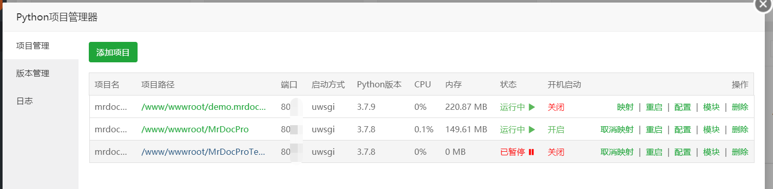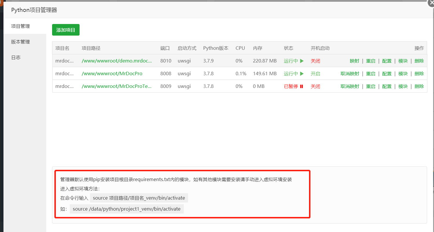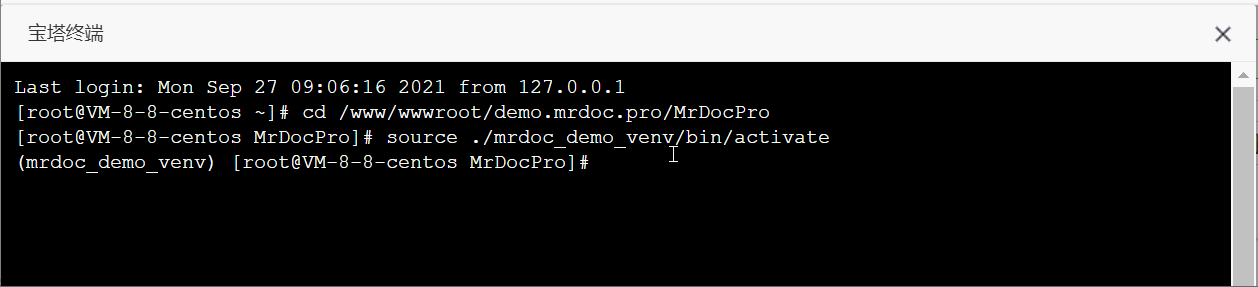 > d 下述文档仅支持宝塔面板「Python项目管理器1.9版本」 使用宝塔面板的「Python项目管理器」可以很方便地部署 Python Web 应用。 MrDoc 也推荐使用宝塔面板进行部署。  在某些情况下,我们需要在宝塔面板的命令行终端手动执行一些 MrDoc 的命令,这些时候需要在 MrDoc 的项目目录内激活虚拟环境后再进行命令的执行。 宝塔面板的「Python项目管理器」窗口中有介绍如何使用项目的虚拟环境  在此我们做一个示例介绍。 ## 激活虚拟环境 示例项目名为:`mrdoc` 示例项目路径为:`/www/wwwroot/MrDoc`  所以项目的虚拟环境路径为:`/www/wwwroot/MrDoc/{项目名}_venv`,也就是`/www/wwwroot/MrDoc/mrdoc_venv` 激活虚拟环境的命令为: ``` source /www/wwwroot/MrDoc/mrdoc_venv/bin/activate ``` 我们可以点击项目路径,跳转到项目路径所在的目录,输入下述命令快速激活虚拟环境: ``` source ./mrdoc_venv/bin/activate ``` 如下图所示:  ## 退出虚拟环境 如果在激活虚拟环境之后需要退出虚拟环境,直接在命令行终端输入如下命令即可: ``` deactivate ```