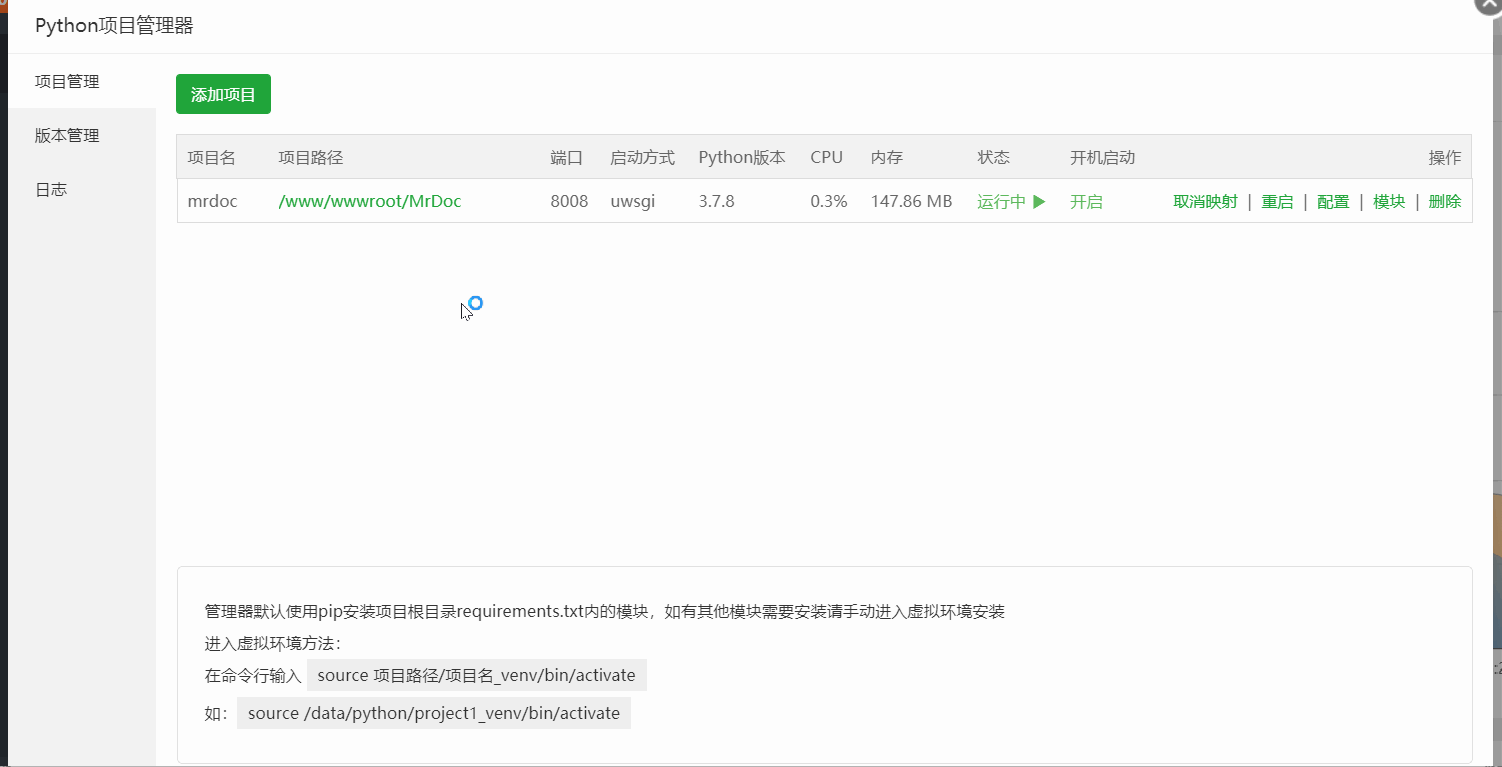 宝塔面板「Python项目管理器」虚拟环境使用问题
