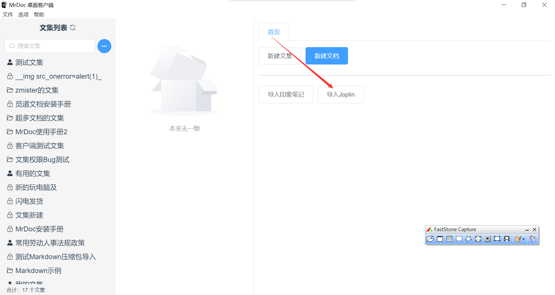 MrDoc 觅思文档支持将 Joplin 中的文档导入到 MrDoc 觅思文档中。 ## 一、新建一个文件夹 首先,在桌面新建一个文件夹,用于存放 Joplin 导出的文件。  ## 二、导出 Joplin 笔记本 打开最新版本的 Joplin,点击「文件」菜单,选择「全部导出」-->「MD - Markdown」:  在弹出的文件夹选择框中选择之前新建的空文件夹:  之后可以看到 Joplin 中的笔记本已经导出到了文件夹中:  ## 三、导入 MrDoc 觅思文档 打开 MrDoc 桌面客户端,在首页点击「导入 Joplin」按钮。  在弹出框界面中点击「选择本地文件夹」按钮,选择之前新建的文件夹:  最后点击「导入」按钮即可。