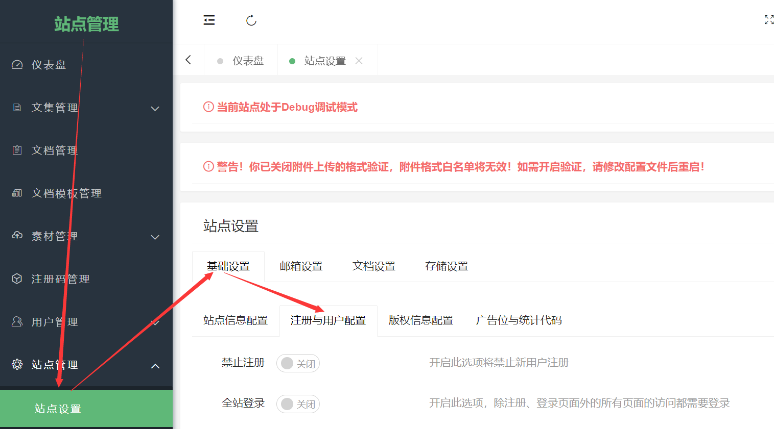 MrDoc觅思文档支持对用户注册、用户登录等功能进行配置。配置路径为: 开源版:后台管理 --> 站点设置 专业版:后台管理 --> 站点设置 --> 基础设置,如下图所示:  下面介绍各个配置项。 ## 默认登录方式 > d 设置其他的默认登录方式后,系统登录页面将不可访问,也就是不再支持用户名+密码的登录方式。 觅思文档的默认登录方式为系统用户名+密码登录,专业版还支持了接入钉钉、企业微信、LDAP、OIDC等第三方认证。 当你配置了这些第三方认证后,默认系统登录页面会显示对应的第三方登录图标按钮,如果你希望用户访问登录页面后直接跳转对应的第三方登录链接上,那么可以设置默认的登录方式为指定的第三方登录。 ## 游客入口 用于控制在文集列表首页、帮助中心首页上显示/隐藏登录注册的菜单链接。 ## 禁止注册 如果你的站点不需要开放新用户的注册,那么可以启用「禁止注册」开关。开启此开关后,页面注册入口将关闭,管理员仍然可以在后台管理的「用户管理」页面新建账号。 ## 注册强密码 默认情况下,觅思文档对新用户注册的密码要求是不少于6位数,可以包含纯数字。如果你的使用环境需要高强度密码,那么可以启用「注册强密码」开关。开启此开关后,用户注册的密码规则为长度大于等于8,且包含大写字母、小写字母、数字、特殊符号。 ## 全站登录 如果你的站点不希望游客(未登录的用户)进行访问,那么可以开启「全站登录」开关。开启此功能后,游客访问站点页面(公开分享的文集、文档除外)将跳转至登录页面。 ## 单处登录 开启单处登录后,用户不能同时多处在线,一处登录后,其他登录状态将被强制下线。 ## 注册码 如果你的站点允许用户注册,但是又有一定的限制,那么可以启用「注册码」功能。开启此功能后,用户注册时需要填写注册码才能注册成功。 注册码的创建和管理在「后台管理」页面的「注册码管理」页面。 ## 注册码提示 用于提示用户如何获取注册码的网页链接,留空则不显示 ## 注册邮箱验证 > d 此功能需要在后台进行发件邮箱配置。 默认情况下,用户注册时可以随便填写电子邮箱。如果你需要对用户填写的电子邮箱进行验证,那么可以开启「注册邮箱验证」开关,开启此功能后,用户注册时填写电子邮箱后,将会发送一封验证邮件,用户需要填写正确邮件验证码才能完成注册。 ## 登录验证码 默认情况下,用户的登录只需要输入用户名和密码。如果你需要用户登录时输入验证码,那么可以开启「登录验证码」开关,开启此功能后,用户登录时将需要输入用户名、密码和验证码。 ## 新用户权限 >i 此配置会影响包括第三方登录接入在内的所有新用户读写权限。 默认配置下,新用户注册之后只有「只读」权限,你可以将其配置为「读写」权限,然后分别对新用户的文集、文档、图片和附件等的权限进行控制。 ## 新用户默认用户组 新用户组注册之后,默认是没有用户组的。在很多情况下,一些文集的协作或浏览权限限定在了某些用户组,那么你可以指定新用户默认加入的用户组。这样,新用户注册之后就不需要手动将其添加到用户组了。