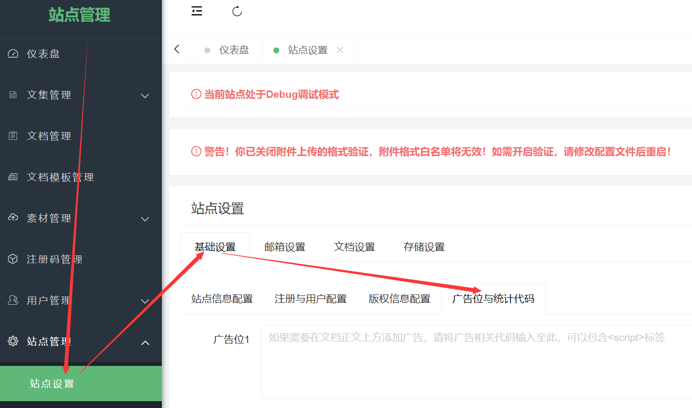 MrDoc觅思文档支持在站点中插入第三方站点统计如CNZZ、百度统计的代码。 配置路径:后台管理 --> 站点设置 --> 基础设置 --> 广告位与统计代码,如下图所示: