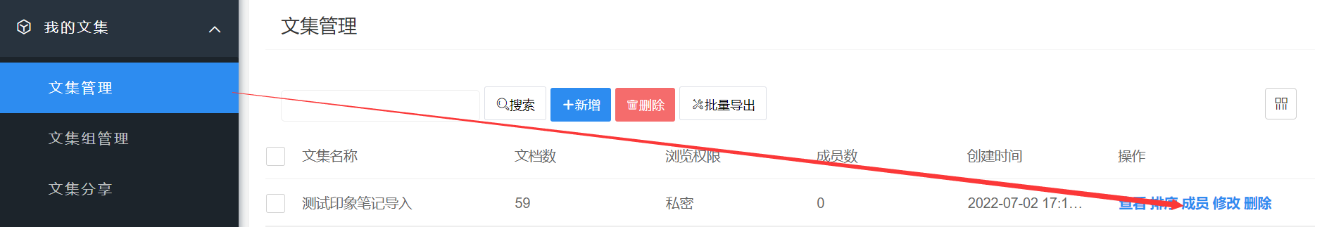 默认情况下,文集内只有文集作者可以创建文档。 如果你需要让其他用户/用户组参与到文集的文档创作中,那么可以添加文集的【协作成员】。 操作路径为:【个人中心】-->【文集管理】页面中的文集列表表格中点击「成员」:  或「文集成员」列数据旁的「设置」图标:  以进入文集成员管理页面,并按需添加成员的协作成员:  添加完成之后,文集的协作成员在文集内即可进行创作:  ## 协作成员权限 **初级权限**:可以在文集内新建文档,可以修改和删除自己创建的文档; **高级权限**:可以在文集内新建、删除和修改任何文档;