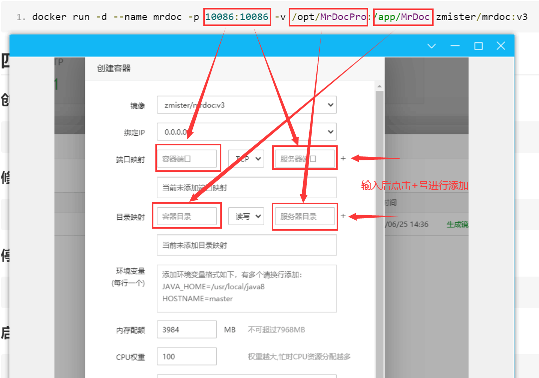> i 官方 Docker 镜像,已自带系统依赖库和软件依赖库、自带数据库初始化和更新命令、自带全文索引构建命令、自带 PDF 导出依赖软件,无需再额外执行命令和安装依赖。 ## 零、安装 Docker <details> <summary>宝塔面板安装 Docker 环境</summary> <img src="/media/202206/2022-06-04_184807_473081.png" /> </details> ### 其他系统安装 Docker 环境 https://www.runoob.com/docker/docker-tutorial.html ## 一、获取 MrDoc 代码 >d **注意1**:请确保已经安装了 Git 工具,如果没有安装,请自行参考 https://www.runoob.com/git/git-install-setup.html 进行安装。 >d **注意2**:内网环境请前往仓库 Web 页面下载代码,然后将代码复制到内网机器相应目录。 ------ 打开终端,进入`opt`目录: >s i 可以在自定义的目录下拉取代码,但是在创建容器的时候务必将`/opt/MrDoc`或`/opt/MrDocPro`替换为你自定义的目录。 ``` cd /opt ``` ### 开源版: ``` git clone https://gitee.com/zmister/MrDoc.git ``` ### 专业版: ``` git clone https://{用户名}:{密码}@git.mrdoc.pro/MrDoc/MrDocPro.git ``` > d 不要在用户名密码外面加花括号! 不要在用户名密码外面加花括号! 不要在用户名密码外面加花括号! 例如: ``` git clone https://mrdoc:123456@git.mrdoc.pro/MrDoc/MrDocPro.git ``` ### 修改`docker_mrdoc.sh`文件换行符 如果你的宿主机操作系统是 Windows,请使用`VSCode`、`Notepad++`等软件,打开`docker_mrdoc.sh`,将文件换行符从`Windows(CRLF)`修改为`Unix(LF)`。 ## 二、获取 Docker 镜像 ### 方式一:在线拉取镜像 ``` docker pull zmister/mrdoc:v9.3 ``` 阿里云镜像(国内拉取速度更快) ``` docker pull registry.cn-hangzhou.aliyuncs.com/zmister/mrdoc:v9.3 ``` ### 方式二:导入离线镜像 > i 适合内网环境、网络较差的环境以及无法拉取镜像的情况 **离线 Docker 镜像下载** 百度网盘: https://pan.baidu.com/s/1OExl7iEz62YSF4u6aQ0UGA?pwd=fr87 提取码: fr87 夸克网盘:https://pan.quark.cn/s/ee6ecd87ffc8 ``` docker load -i docker-mrdoc-env.v9.3.amd64.tar ``` ## 三、运行 Docker 容器 > i 如果使用阿里云镜像,修改`zmister/mrdoc`为`registry.cn-hangzhou.aliyuncs.com/zmister/mrdoc` ### 开源版: ``` docker run -d --name mrdoc --restart always -p 10086:10086 -v /opt/MrDoc:/app/MrDoc zmister/mrdoc:v9.3 ``` 阿里云镜像: ``` docker run -d --name mrdoc --restart always -p 10086:10086 -v /opt/MrDoc:/app/MrDoc registry.cn-hangzhou.aliyuncs.com/zmister/mrdoc:v9.3 ``` ### 专业版: ``` docker run -d --name mrdoc --restart always -p 10086:10086 -v /opt/MrDocPro:/app/MrDoc zmister/mrdoc:v9.3 ``` 阿里云镜像: ``` docker run -d --name mrdoc --restart always -p 10086:10086 -v /opt/MrDocPro:/app/MrDoc registry.cn-hangzhou.aliyuncs.com/zmister/mrdoc:v9.3 ``` ### 宝塔 Docker 管理器图形界面操作:  ## 四、管理 ### 创建管理员账户 ``` docker exec -it mrdoc python manage.py createsuperuser ``` ### 修改用户密码 ``` docker exec -it mrdoc python manage.py changepassword 用户名 ``` ### 停止容器 ``` docker stop mrdoc ``` ### 启动容器 ``` docker start mrdoc ``` ### 删除容器 ``` docker rm -f mrdoc ``` ### 查看日志 ``` docker logs mrdoc ``` ## 五、版本更新 0、进入觅思文档的项目目录内: >i 1、如果没有按照文档使用`/opt`作为项目根目录,自行更改相应路径。 > > 2、务必查看版本更新记录,确认是否需要升级镜像版本。 ```bash # 开源版 cd /opt/MrDoc # 专业版 cd /opt/MrDocPro ``` 1、拉取代码: ```bash git fetch --all && git reset --hard origin/master && git pull ``` 2、重启 Docker 容器 ``` docker restart mrdoc ``` ## 六、使用Nginx反向代理/绑定域名 Docker 容器运行成功之后,你就可以通过`http://IP:端口号`来访问和使用觅思文档了。 但是我们推荐的部署流程并没完成,我们推荐你使用 Nginx 对`127.0.0.1:10086`进行反向代理。 如果你需要为`http://IP:端口号`进行绑定映射域名、托管静态文件等操作,都可以在 Nginx 中进行。 详见文档: - [使用 Nginx 配置反向代理/绑定域名](https://doc.mrdoc.pro/doc/44910/) - [使用 Nginx 托管静态文件资源](https://doc.mrdoc.pro/doc/44876/) - [使用 Nginx 开启 SSL / 设置 HTTPS](https://doc.mrdoc.pro/doc/44904/) ## 七、升级镜像 1、停止容器 ``` docker stop mrdoc ``` 2、删除容器 ``` docker rm -f mrdoc ``` 3、执行步骤二、步骤三 ## 八、内网环境的升级 0、停止容器。 1、备份 MrDoc 代码目录内的`media`、`config`目录。 2、如果使用的 Docker 镜像不是最新版本,按步骤二获取最新的 Docker 离线镜像。 3、下载最新版本的 MrDoc 代码。 4、将备份的`media`、`config`文件夹覆盖到最新的 MrDoc 代码目录内。 5、删除容器。 6、按步骤三运行 Docker 容器。 ## 九、使用 MySQL 数据库 详见:https://doc.mrdoc.pro/doc/44846/ ## 十、常见问题 ### 1、docker_mrdoc.sh 问题 Q:容器启动后日志显示:`docker_mrdoc.sh: No such file or directory`、`docker_mrdoc.sh: line 17: syntax error: unexpected end of file (expecting "then")`、`not found docker_mrdoc.sh` 等涉及 docker_mrdoc.sh文件的错误。 A:因为`docker_mrdoc.sh`文件的换行符应当是 LF,而非 CRLF,如果你在 Windows 平台上拉取的代码或者使用 CRLF 的代码编辑器操作过这个文件,可能就会出错。 Windows 平台下可以使用`vscode`、`notepad++`,Linux 平台下可以使用`dos2unix`对文件的换行符进行转换。 此外,在命令行终端输入如下命令: ``` git config --global core.autocrlf input ``` 避免后续更新拉取代码后,`docker_mrdoc.sh`文件的换行符又变为`CRLF`。