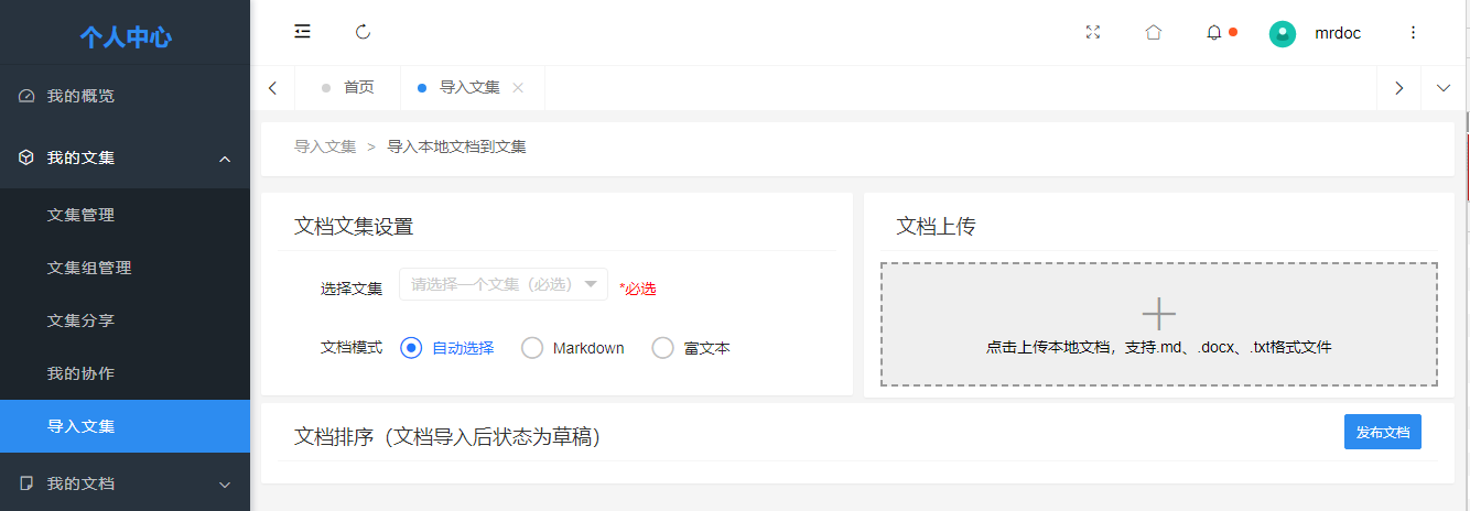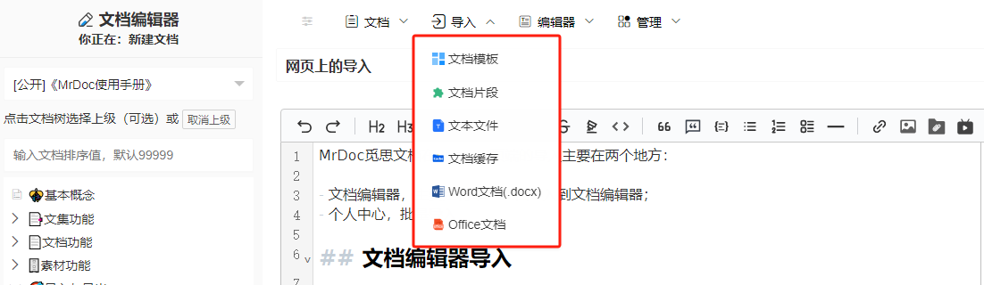 MrDoc觅思文档在 Web 网页端的导入主要在两个地方: - 文档编辑器,主要是将单一文档导入到文档编辑器; - 个人中心,批量导入 ## 1. 文档编辑器导入 进入「新建文档」页面,鼠标悬浮在顶部导航栏的「导入」菜单上,会显示支持导入的文档类型,选择需要导入的文档类型后,在本地文件选择框里面选择需要导入的文件,等待后台上传转换即可。 目前支持: - 文本文档(Markdown、Text 等)、 - .docx格式的Word文档 - 各类 Office 文档  ## 2. 个人中心导入 个人中心支持两种导入方式: - 本地文档导入 - 文集大纲导入 入口为:「个人中心」-「文集管理」-「导入文集」  ### 2.1 本地文档导入 此导入方式支持批量将本地Markdown、text和docx格式的Word文件导入到指定文集。  导入文档后点击「发布文档」按钮即可。 ### 2.2 文集大纲导入 文集大纲导入可以便捷地通过可视化思维导图编辑器创建一个预设了文档结构的文集,思维导图的结构即是文集内文档的结构,一级节点是文集名称、其余子节点都是层级的文档。  编辑好文集结构后,点击「创建文集和文档」按钮即可。