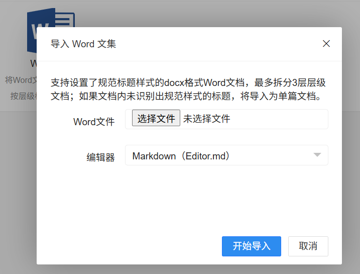 MrDoc觅思文档在 Web 网页端的导入主要在两个地方: - 文档编辑器,主要是将单一文档导入到文档编辑器; - 个人中心,批量导入 ## 1. 文档编辑器导入 进入「新建文档」页面,鼠标悬浮在顶部导航栏的「导入」菜单上,会显示支持导入的文档类型,选择需要导入的文档类型后,在本地文件选择框里面选择需要导入的文件,等待后台上传转换即可。 目前支持: - 文本文档(Markdown、Text 等)、 - .docx格式的Word文档 - 各类 Office 文档  ## 2. 个人中心导入 个人中心支持以下导入方式: - 本地文档导入 - 文集大纲导入 - Word文集导入 入口为:「个人中心」-「文集管理」-「导入文集」  ### 2.1 本地文档导入 此导入方式支持批量将本地Markdown、text和docx格式的Word文件导入到指定文集。  导入文档后点击「发布文档」按钮即可。 ### 2.2 文集大纲导入 文集大纲导入可以便捷地通过可视化思维导图编辑器创建一个预设了文档结构的文集,思维导图的结构即是文集内文档的结构,一级节点是文集名称、其余子节点都是层级的文档。  编辑好文集结构后,点击「创建文集和文档」按钮即可。 ### 2.3 Word 文集导入 觅思文档支持包含规范标题样式的Word文档直接导入为拆分好文档的文集。 - 可选择导入为 markdown 文档或富文本 - 最多支持3个层级的标题格式 - 最多只解析到“标题三”的标题样式 - 可以只包含单个标题样式。