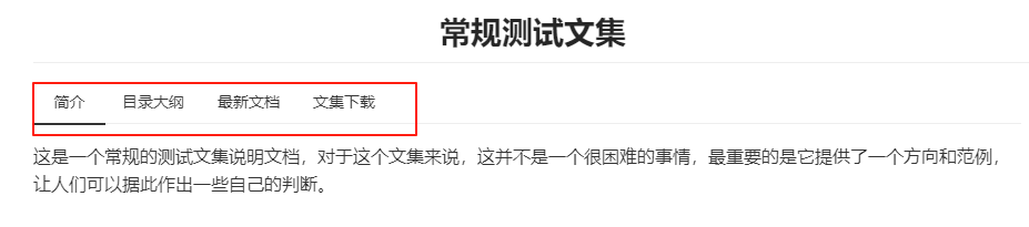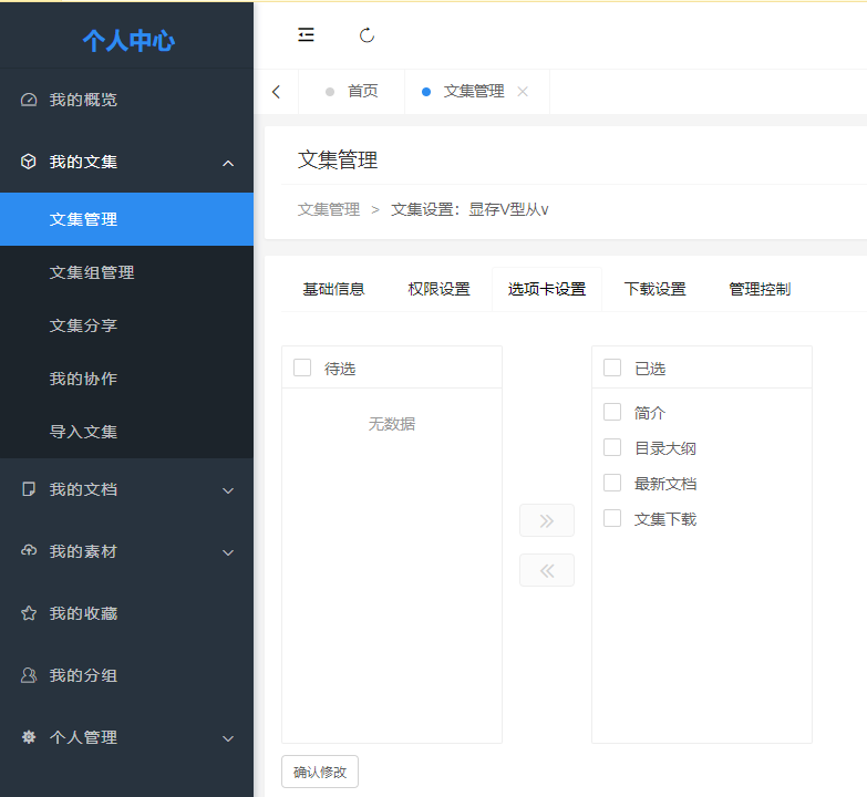文集页面默认会显示「文集简介」、「文集目录」、「最新文档」和「文集下载」(站点开启「文集下载」的情况下)选项卡。如下图所示:  如果你需要隐藏某些选项卡或调整这些选项卡的顺序,可以在 个人中心-文集管理-文集修改页面里面的「选项卡」进行配置: