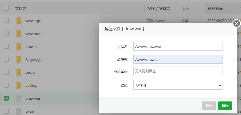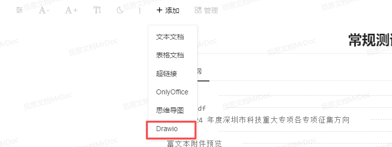 Drawio 是一个免费开源的在线图表绘制工具,觅思文档支持接入 Drawio 图形编辑器来创建 Drawio 文档。 ## 一、部署 Drawio 在接入 Drawio 之前,你需要自行部署好 Drawio 服务。下面介绍两种部署方式: ### 1.1、宝塔直接部署 在 Drawio 的 GitHub 仓库(https://github.com/jgraph/drawio/releases )下载最新的`war`格式安装包文件:  然后上传到服务器并解压到`/www/`目录下:  接着添加一个站点,在站点设置的配置文件中,将`root` 的路径修改为`/www/drawio`:  这样访问域名就可以看到熟悉的 Drawio 界面了。 ### 1.2、Docker 部署 如果你更偏向于容器化部署,那么执行下面的命令即可在8080端口上运行起一个Drawio服务: ``` docker run -d --restart=always --name="draw" -p 8080:8080 jgraph/drawio ``` ## 二、接入 Drawio 在 Drawio 部署好之后,在后台管理页面-站点管理-站点设置-文档设置中的,将Drawio地址填入 Drawio 配置表单即可:  然后在首页或文档内的新建文档下拉按钮中,就可以选择新建「Drawio」文档:  然后在 Drawio 编辑器中创建各类图形: