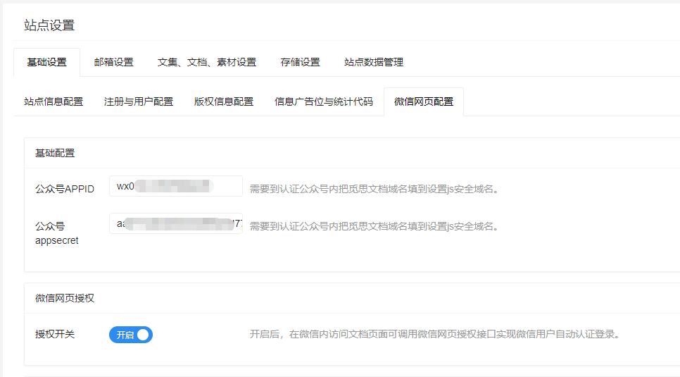 微信网页授权借助已认证的微信服务号,实现在微信客户端内打开觅思文档的链接时,通过调用微信的授权接口,实现自动认证和登录。 ## 获取微信公众号信息 在微信公众号管理平台的「开发接口管理」页面,获取服务号的`APPID`和`AppSecret`信息:  在「账号设置」页面将你的觅思文档域名添加到「JS接口安全域名」:  ## 觅思文档配置 在后台站点管理-站点设置页面的「微信网页」配置选项卡中: - 填入对应的微信公众号APPID和APPSECRET信息 - 启用「微信网页授权」开关 就完成了微信网页授权的配置: