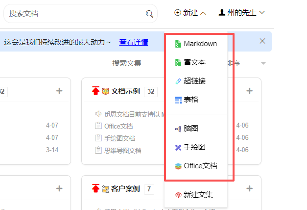 ## 如何创建第一篇文档(Markdown与富文本编辑) 文档是知识库的基石,觅思文档(MrDoc)支持多种类型的文档以适应不同场景的知识库需求。本文将介绍如何创建第一篇文档,助你开启知识库管理的真正旅程。 ### 一、新建文档 通常来说,你会在首页顶部「新建」菜单里面选择一个文档类型以开始文档的编辑。  除此之外,你还可以在文集文档页面的顶部工具栏里面选择文档类型以新建文档。  或者,在文集文档页面的左侧文集目录中新建指定文档的下级文档。  ### 二、切换文档编辑器 在你进入进入新建文档页面之后,如果发现当前的编辑器不是自己想要的,那么可以在顶部工具栏的编辑器里面切换别的编辑器使用。