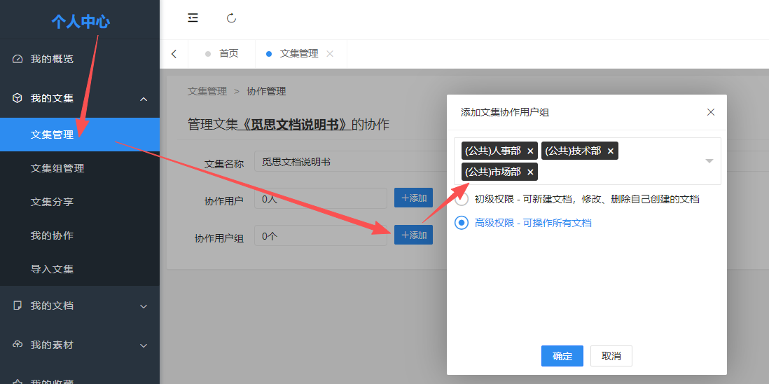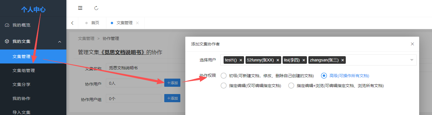 ## 如何添加团队成员协作使用文集 觅思文档(MrDoc)原生支持团队协作共建文集(知识库),本文将介绍如何在觅思文档 MrDoc 中添加文集的协作成员,适用于文集知识库共建和团队协作。 ### 一、添加协作用户 在个人中心的文集管理页面,点击「成员」按钮,进入到文集的协作成员管理页面。 在「协作用户」一栏后点击「添加」按钮,然后在弹出的对话框中选择需要添加的用户和协作权限即可。  ### 二、添加协作用户组 在个人中心的文集管理页面,点击「成员」按钮,进入到文集的协作成员管理页面。 在「协作用户组」一栏后点击「添加」按钮,然后在弹出的对话框中选择需要添加的用户组和协作权限即可。